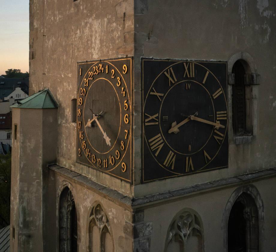 Raritou je staročeský ciferník dělený na 24 hodin, přenesený na kostelní věž