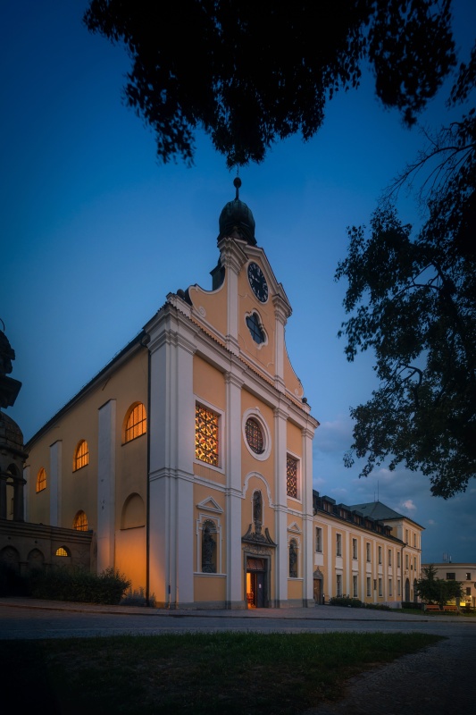 Poblíž současného areálu si původně roku 1674 postavili řeholníci provizorní kapli a řeholní dům, které jim sloužily do roku 1705. V letech 1679 – 1733 vznikl nový barokní kostel zasvěcený sv. Rodině a jednopatrová klášterní budova. Na stavbě se podílelo několik stavitelů – východní část s presbytářem postavil Gian Batista (patrně z Chrudimě) a západní část vystavěl Daniel Měnický z Chrudimě, průčelí kostela je ze začátku 18. století – dle návrhu řádového bratra Filipa à Sancto Hermanno, jenž je také autorem soch svaté Rodiny.