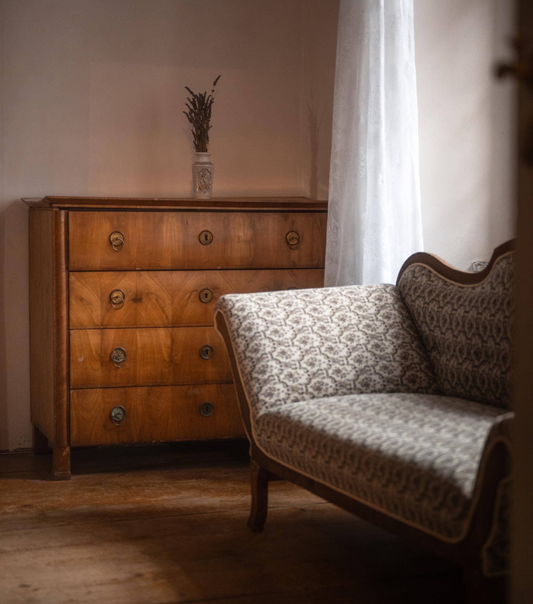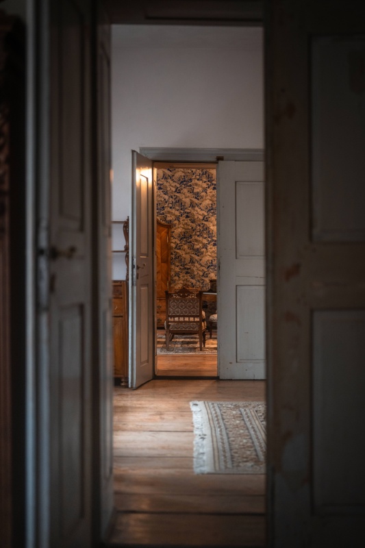 dochované historické prvky uvnitř zámečku, včetně dobových detailů, jako jsou barokní ostění nebo kachlová kamna.