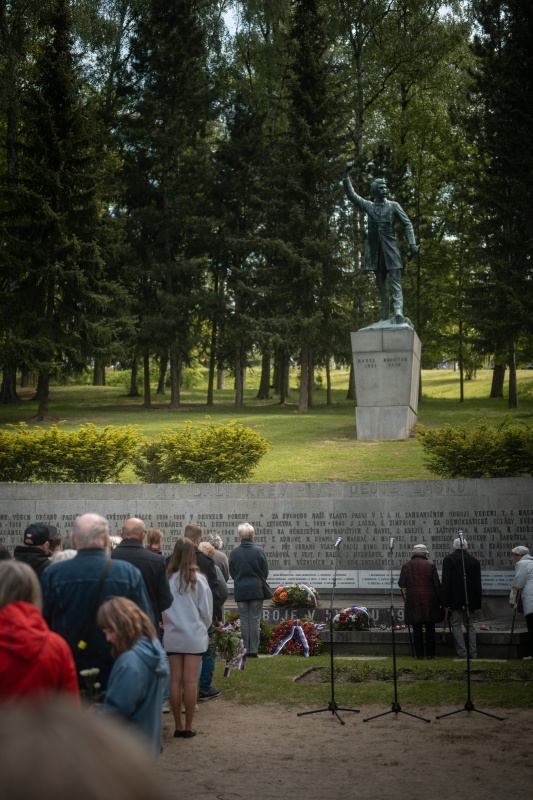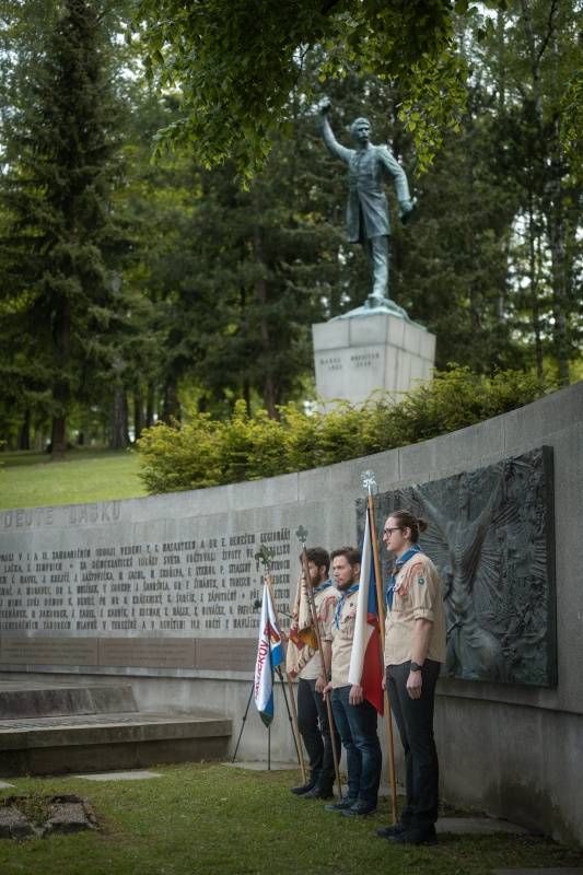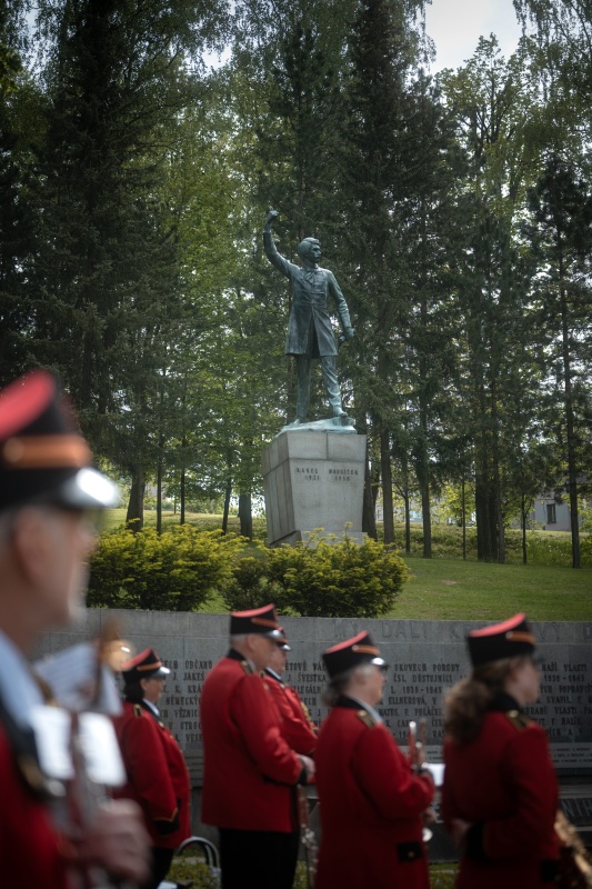 Nachází se v těsné blízkosti pomníku K. H. Borovského. Po šesti letech německé okupace se město dočkalo osvobození. Radost ze svobody se však mísila se smutkem, protože poslední dny 2. světové války v Německém Brodě byly tragické. Dne 5. 5. 1945, po zprávách o Pražském povstání, oznámil nově ustanovený revoluční národní výbor obnovení Československé republiky, převzetí správy nad městem a jeho přejmenování na Havlíčkův Brod. Po počátečním vyjednávání s německými okupanty obklíčily jednotky SS radnici a ve městě bylo vyhlášeno stanné právo. Začaly represálie proti ozbrojeným vlastencům, které trvaly až do 8. 5., kdy Němci začali ustupovat. Město bylo osvobozeno příchodem vojsk 2. ukrajinského frontu maršála Malinovského dne 9. 5. Oslavu vítězství však zkalilo objevení hromadných hrobů umučených rukojmích v Lázničkově stráni a v Hurtově Lhotě u Věže. Po exhumaci byly tělesné ostatky umučených pietně pohřbeny 14. 5. 1945 za účasti celého města v městských sadech, v místech plánovaného památníku, věnovaného obětem války. Zásluhu na stavbě pomníku měl A. Šouba, předseda městského národního výboru. Vzhledem k poválečné situaci byl památník slavnostně odhalen až 11. 5. 1947, o rok později než pomník Havlíčkův. Oblouk z leštěné žuly se jmény brodských občanů, kteří zahynuli ve dvou světových válkách, navrhl architekt František Marek. Jejich seznam zmizel v roce 1975, protože někteří nevyhovovali komunistické ideologii, a nahradily jej bronzové reliéfy (1977). Jména padlých se vrátila na pomník až ve změněné politické situaci a byla doplněna jmény židovských spoluobčanů, kteří se nevrátili z koncentračních táborů.
