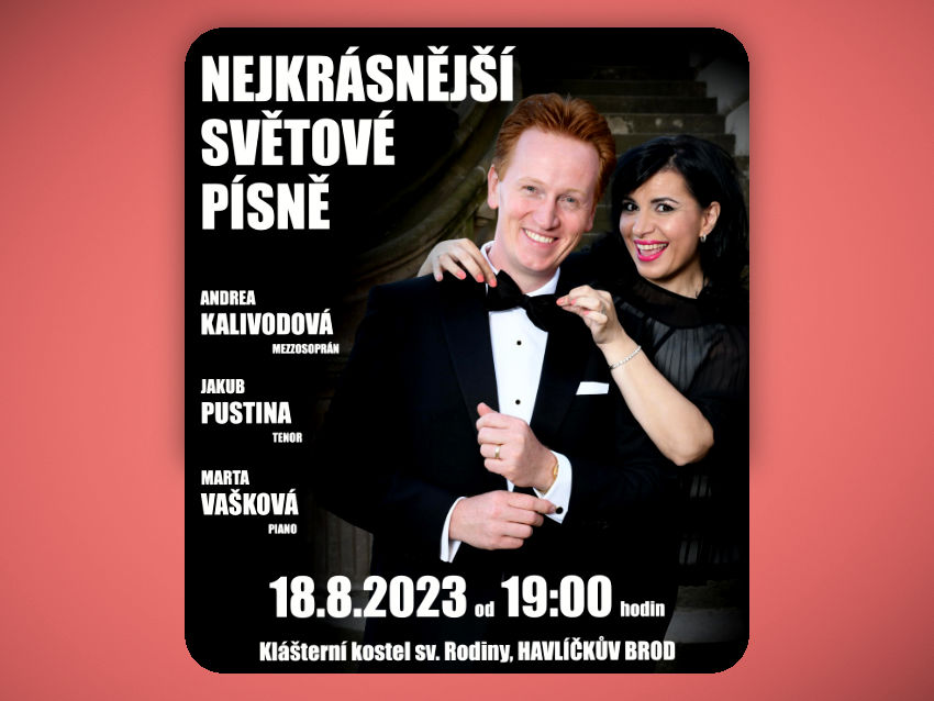 Koncert v rámci 17. ročníku festivalu „Jakub Pustina a jeho hosté“ s názvem "Nejkrásnější světové písně". V tomto programu vystoupí mezzosopranistka Andrea Kalivodová s tenoristou Jakubem Pustinou s velice poutavým a přitažlivým repertoárem. Program je složen z nejznámějších světových písní, jako je například: O sole mio, Granada, Santa Lucia, Funicula a mnohé další. Oba umělce na klavír doprovodí docentka Janáčkovy akademie múzických umění Marta Vašková.hostem bude Andrea KALIVODOVÁ