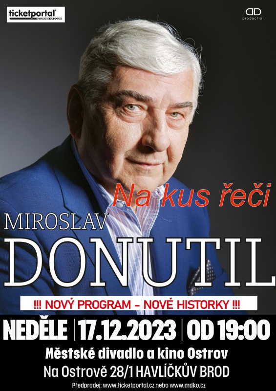Pro všechny, kteří milují dobrý český humor, jsme připravili opravdovou lahůdku! Populární český bavič a herec MIROSLAV DONUTIL přijede představit jednu ze svých one man show, které mají vždy velký úspěch. Tentokrát to bude nejoblíbenější pořad Na kus řeči.