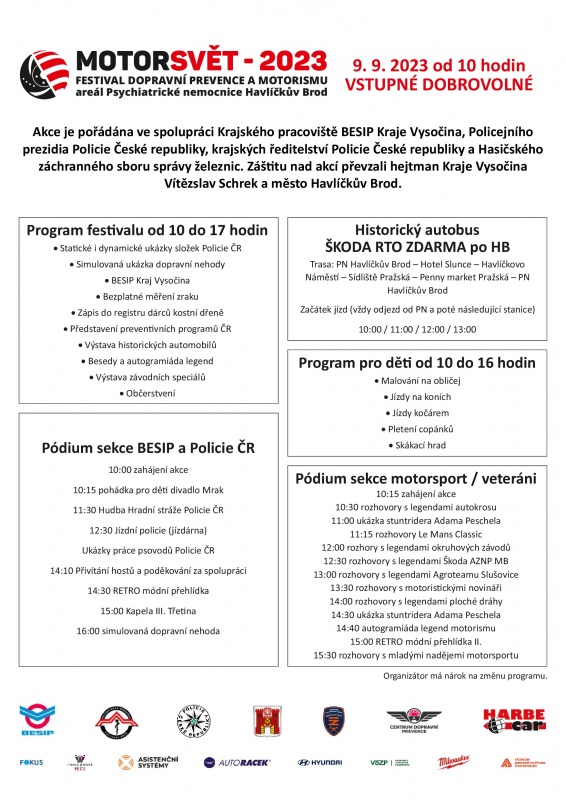 Už tento je tu MotorSvět 2023 – Festival dopravní prevence a motorismu v Havlíčkově Brodě. Brány areálu Psychiatrické nemocnice Havlíčkův Brod se veřejnosti otevřou v 10 hodin a III. ročník nabídne opět skvělý program. Akci pořádá Veronika Vošická Buráňová (Krajský koordinátor BESIPu) a Radek Pavlíček. Nově se v letošním roce do organizace vložila i Policie ČR a Hasičský záchranný sbor správy železnic. Těšit se můžete na preventivní programy a partnerské subjekty BESIPu. Změříme Vám řidičské reakce, ale i zrak. Nakoupit můžete reflexní prvky, nebo třeba i nové auto. Program je připraven pro celou rodinu. V letošním roce poprvé i kulturní hudební program a dvě sekce – dětské divadlo, koncert Hudby Hradní stráže Policie ČR a kapela III. Třetina. Závěrem akce se představí Hasičský záchranný sbor správy železnic u ukázky technického zásahu u dopravní nehody. Naopak v druhé části areálu si přijdou na své všichni milovníci motorismu – závodní speciály, rozhovory, historická vozidla, klubové srazy, ukázka stuntridera Adama Peschela. Dynamické ukázky nadějí autokrosu i rozhovory s legendami. Povozíte na koních i v kočáře, děti si odnesou obrázek na obličeji i zapletené vlasy. Samozřejmostí bude i svozový autobus Škoda RTO. Událostí Vás provede živé vysílání přímo z Českého rozhlasu Vysočina.