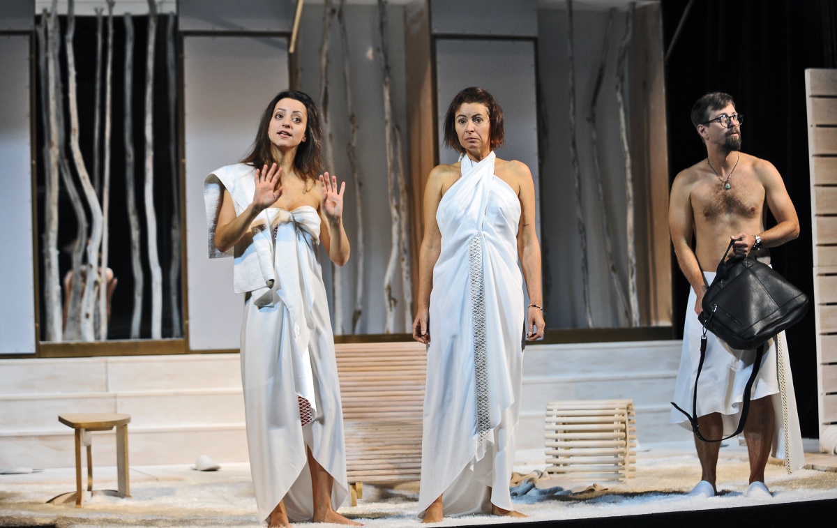 Sauna osamělého luxusního wellness hotelu, tajná pracovní a milostná schůzka, touha po dítěti a potřeba sponzorského daru, to jsou atraktivní ingredience pro brilantní komedii plnou záměn a zmatků, která ale končí laskavým smířením.