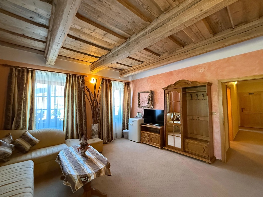 Pokoje penzionu se nachází ve dvou budovách. První, historický objekt je situován do rustikálního stylu. V suterénu se nachází stylová restaurace a salonek s kachlovými kamny. V dalších dvou nadzemních podlažích jsou Vám k dispozici dva jednolůžkové, dva dvojlůžkové pokoje, tři malé a dva velké apartmány.